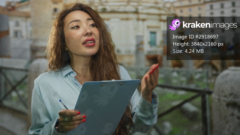Woman caucasian holding clipboard and writing with hands by ancient building ruins near stone railing while reading notes; curiosity exploration reflection. - Kraken Images