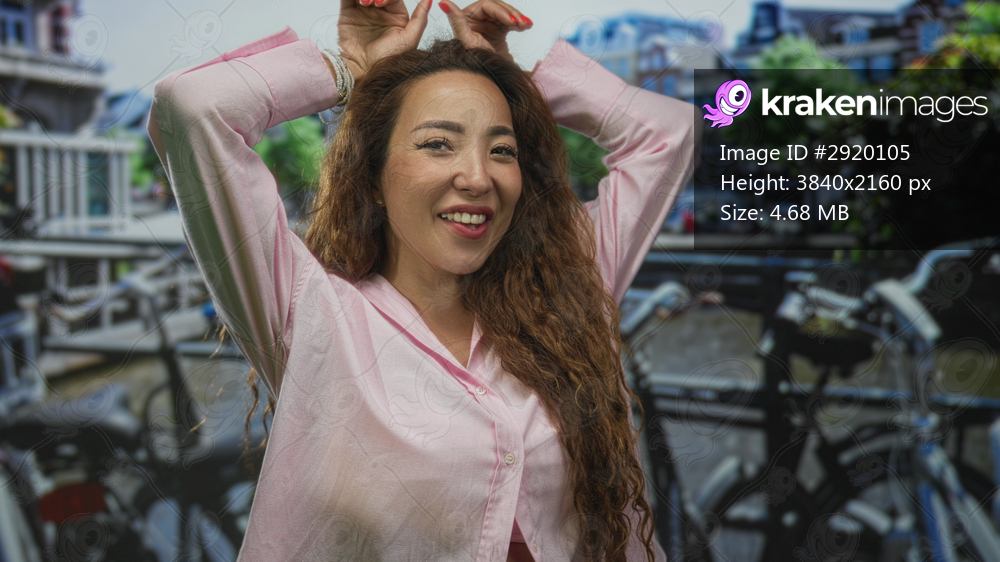 Woman caucasian young smiling with hands raised above head showing face and curly hair on amsterdam street by bicycles; happiness carefree.