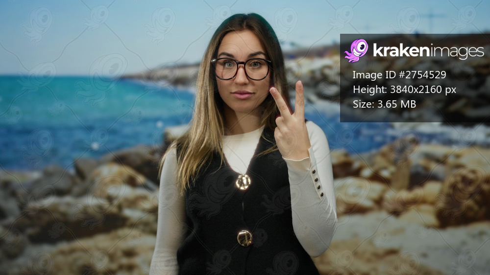 Woman celebrates on a sunny beach with a joyful expression, blonde hair, glasses, looking excited amid the serene seaside scenery.
