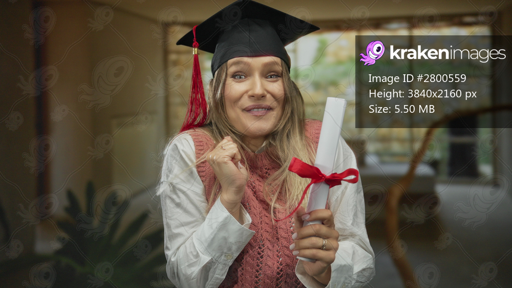 Woman celebrating graduation in hotel lobby holding diploma with red ribbon, smiling happily wearing cap indoors under soft lighting showcasing joyful achievement. - Kraken Images