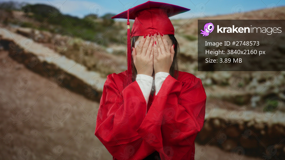 Woman celebrating graduation in red gown and cap outdoors in park setting with joyful expression.