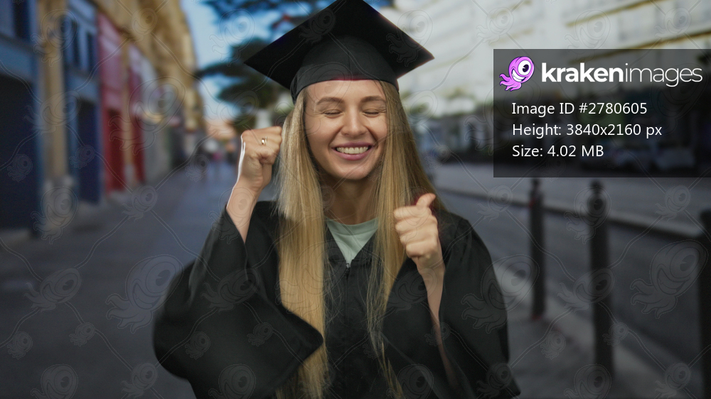 Woman celebrating graduation outdoors in a city street, wearing a cap and gown, smiling with excitement and pride.