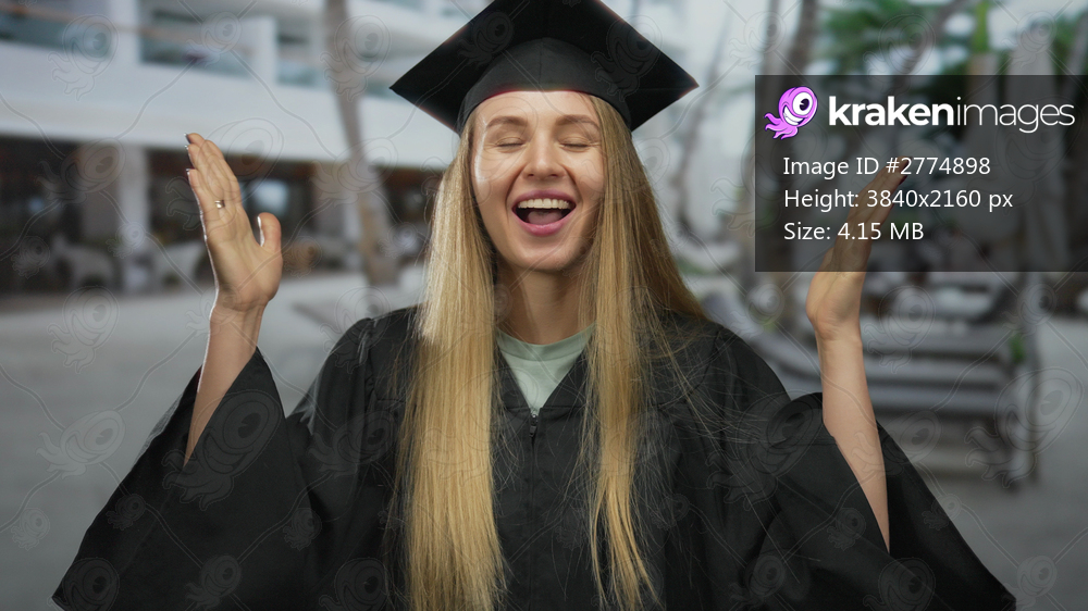 Woman celebrating graduation outdoors in city, wearing cap and gown, smiling joyfully with greenery in the background on a bright day.