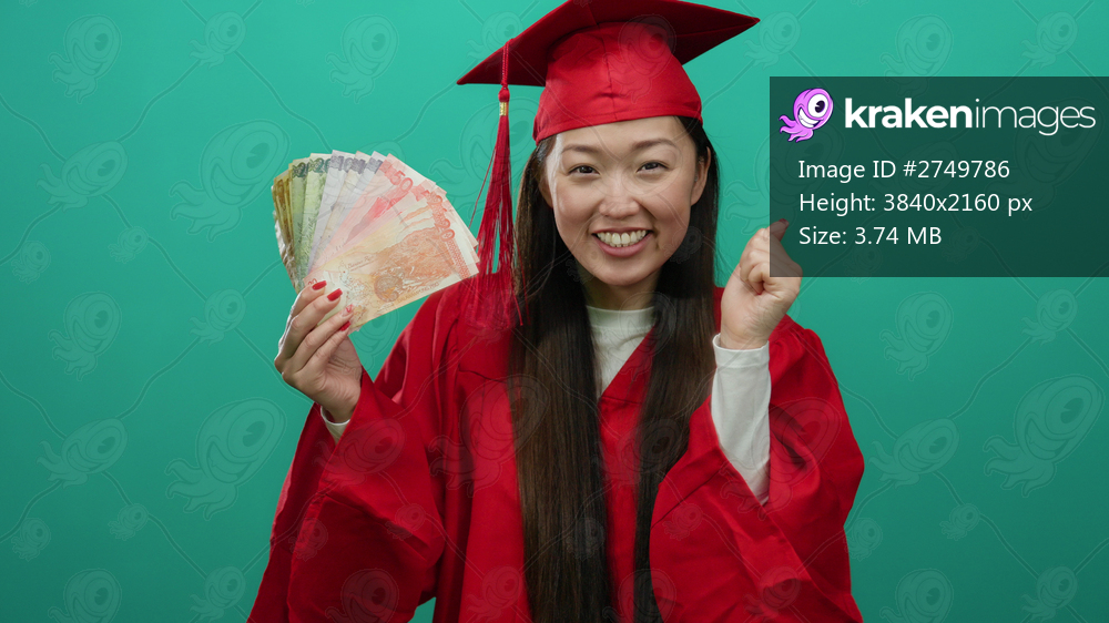 Woman celebrating in red graduation attire holding philippine peso banknotes against a green wall.