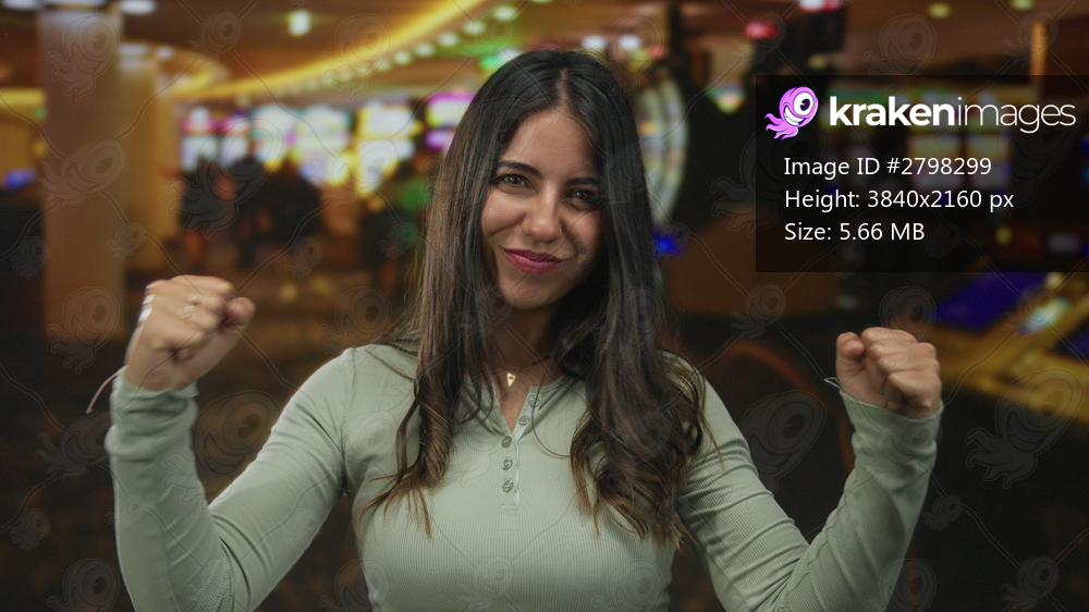 Woman celebrating inside a lively casino with slot machines, exuding joy and excitement, showcasing a winning moment in an indoor gaming environment.