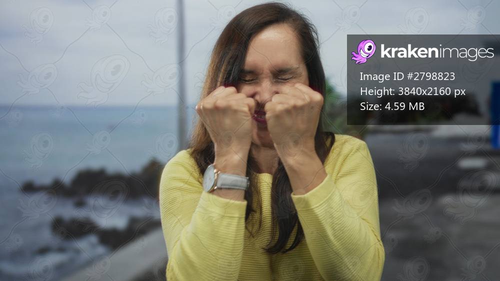 Woman celebrating joyfully by the seaside, smiling brightly against a beach backdrop, emphasizes the cheerful vibe of the smiling young hispanic lady outdoors. - Kraken Images
