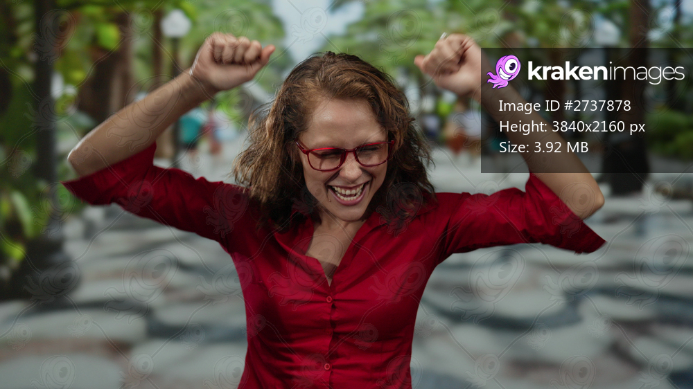 Woman celebrating joyfully in a vibrant park setting, wearing a bright red shirt and glasses, expressing happiness and excitement in the outdoor natural environment. - Kraken Images