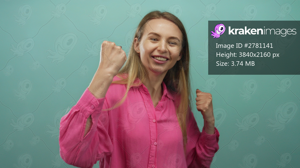 Woman celebrating joyfully wearing pink shirt against isolated green background with arms raised in excitement expressing happiness and success.