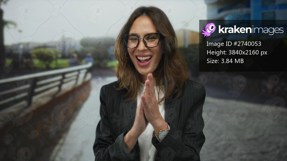 Woman celebrating outdoors in a city street, expressing happiness with raised fists, wearing glasses and a blazer, amidst an urban background suggesting a lively environment. - Kraken Images