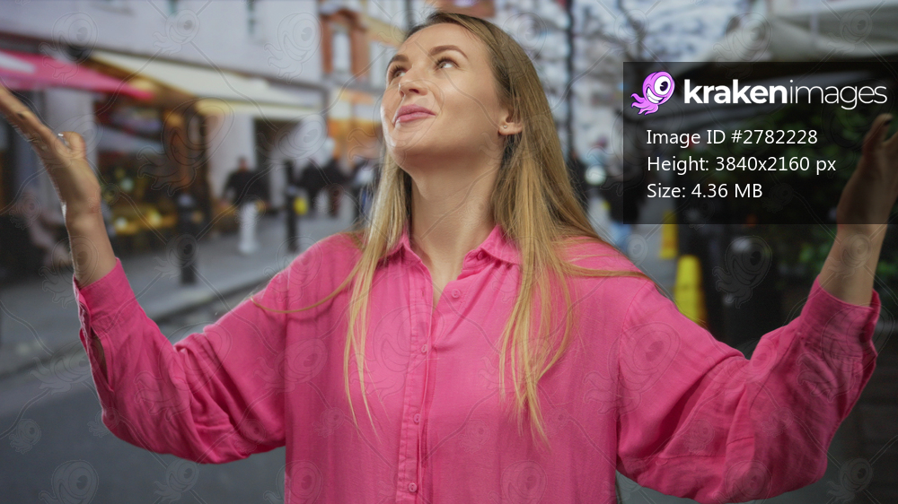 Woman celebrating outdoors on a vibrant city street, wearing a pink shirt, exuding joy and excitement in an urban environment, capturing a lively and cheerful moment. - Kraken Images