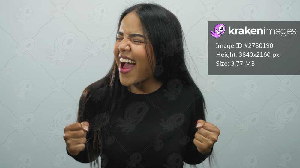 Woman celebrating with raised fists against a white background, expressing joy and success with a triumphant pose in a studio setting.