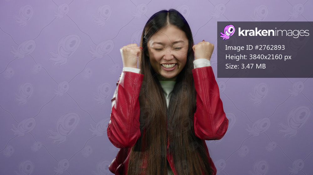 Woman celebrating with raised fists wearing red jacket against isolated purple background expressing joy and excitement in studio setting.