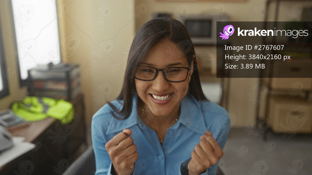 Woman celebrating success in an office with a confident smile, surrounded by office equipment, expressing enthusiasm and positivity in a workplace setting. - Kraken Images