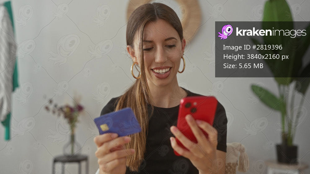 Woman checking payment details on creditcard while holding smartphone in building with focused expression; concern.