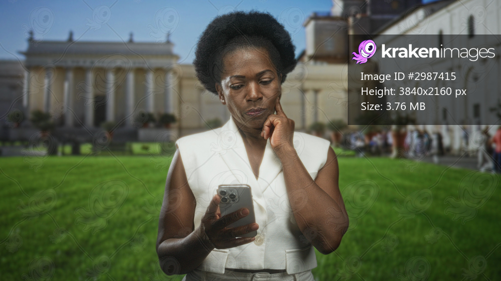 Woman checking smartphone, hand to cheek while standing on a museum lawn in front of a classical columned building; thoughtful.