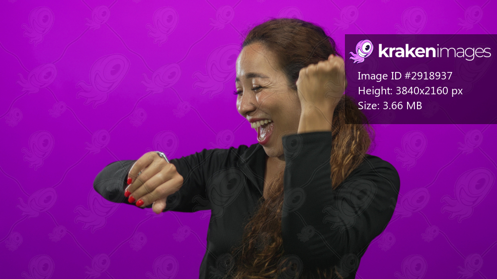 Woman checking smartwatch on wrist while smiling and raising fist in purple studio; joy celebration moment.