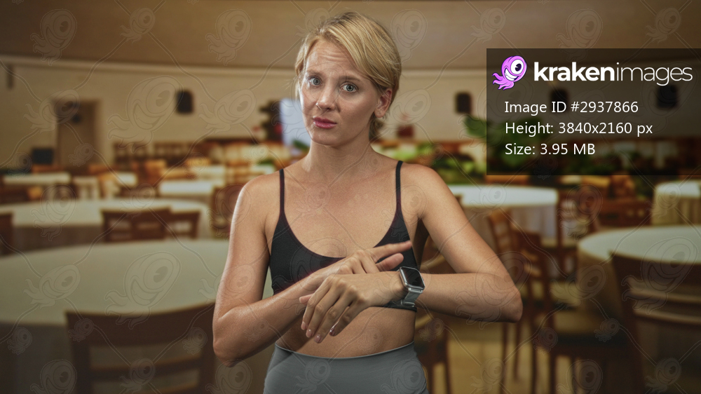 Woman checking smartwatch and pointing at wrist amid a dining room with round tables and chairs in a building; impatience urgency.