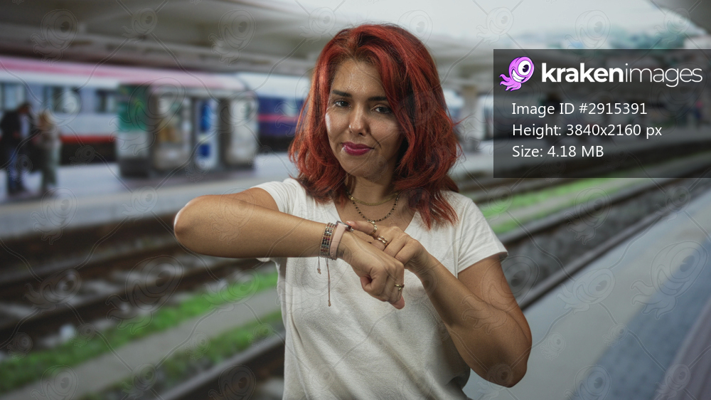 Woman checking watch on wrist at train station building platform, rings and bracelets visible; impatience commute hurry.