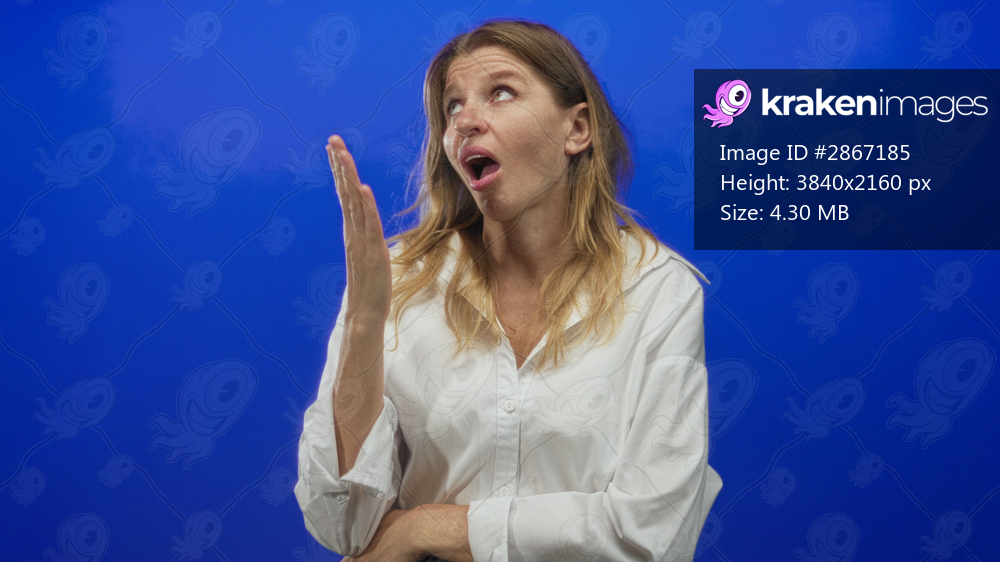 Woman checking wrist and looking at time in studio with blue background, bare forearm visible; boredom waiting.