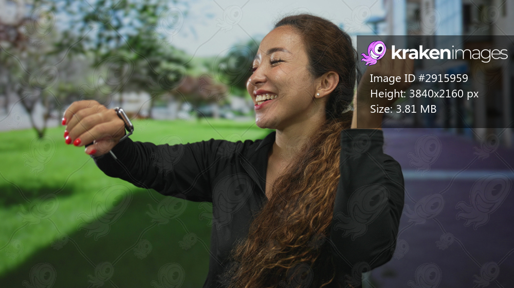 Woman checking wristwatch and pumping fist in celebration on a city street beside a grassy park while smiling broadly; punctuality success joy.