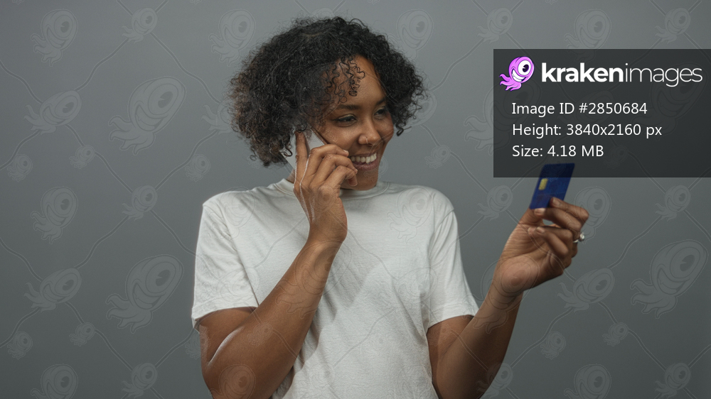 Woman checks creditcard details while holding phone to ear and smiling in studio; confidence empowerment.
