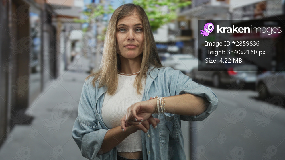 Woman checks silver wristwatch on bustling city street sidewalk with finger pointing to watch face; impatience.