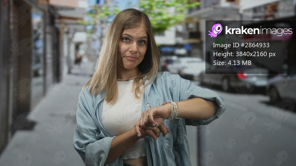 Woman checks silver wristwatch on bustling city street sidewalk with finger pointing to watch face; impatience.