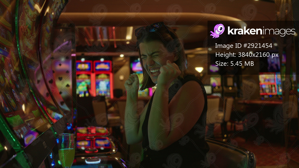 Woman cheering at slot machine in casino building, fists raised and smiling at winning spin; joy luck winning.