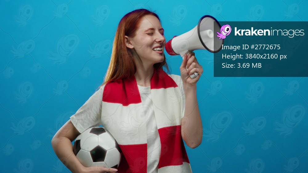 Woman cheering with megaphone while holding soccer ball against blue wall wearing red scarf showing enthusiasm and joy with bright isolated background