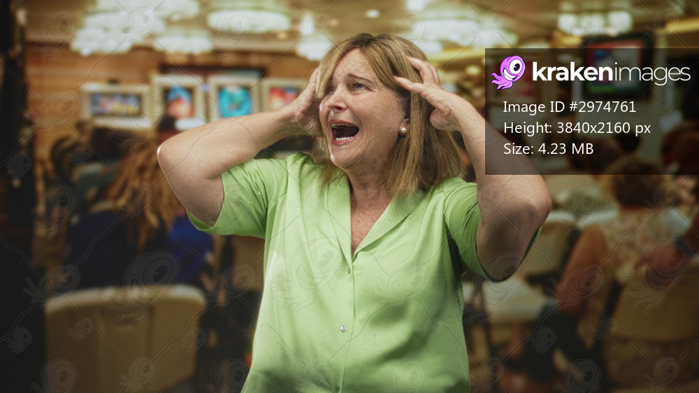 Woman cheering with raised fists and hand to head after a win in a bingo hall building; triumph joy.