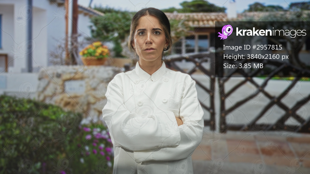 Woman chef with arms crossed and gesturing with one hand in front of a building; frustration focus resolve.