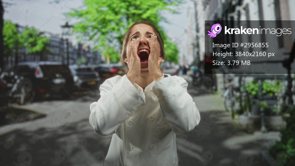 Woman chef cups hands at mouth shouting on a street with bicycles and parked cars visible; celebration joy.