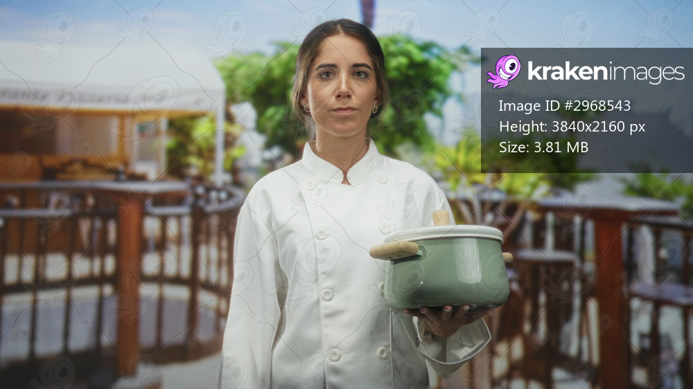 Woman chef holding a green pot and touching chin in a building patio, wearing white chef coat with wooden spoon visible; thoughtful creativity.