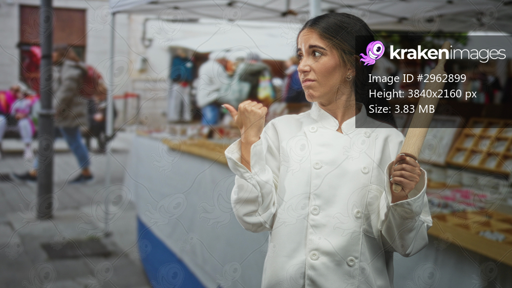 Woman chef holding a rolling pin and pointing with her hand at a street market stall; skeptical resolve.