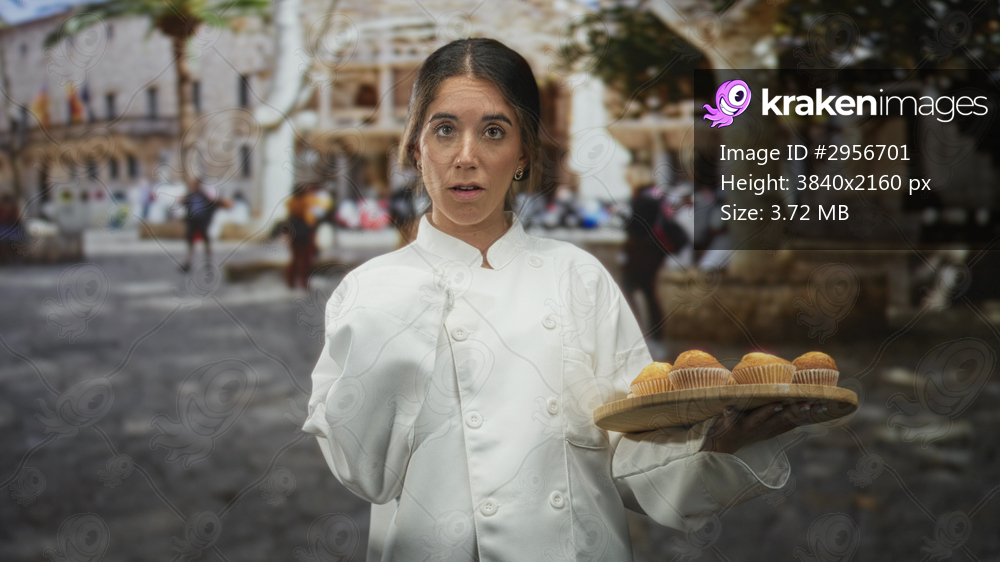 Woman chef holding a wooden tray of muffins, open mouth and hand on chest gesture, wearing white coat in a busy street plaza with trees and stone buildings; surprise hospitality. - Kraken Images