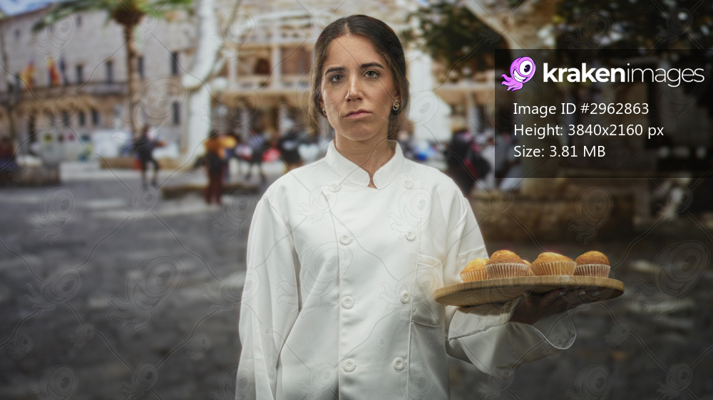 Woman chef holding a wooden tray of muffins, open mouth and hand on chest gesture, wearing white coat in a busy street plaza with trees and stone buildings; surprise hospitality. - Kraken Images