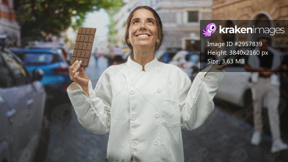Woman chef holding chocolate bar on a cobbled street, smiling while presenting the bar to camera; joy celebration.