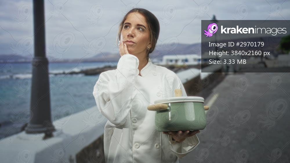 Woman chef holding green pot, hand pointing forward on a seaside street with lampposts and mountains visible; determination decision.