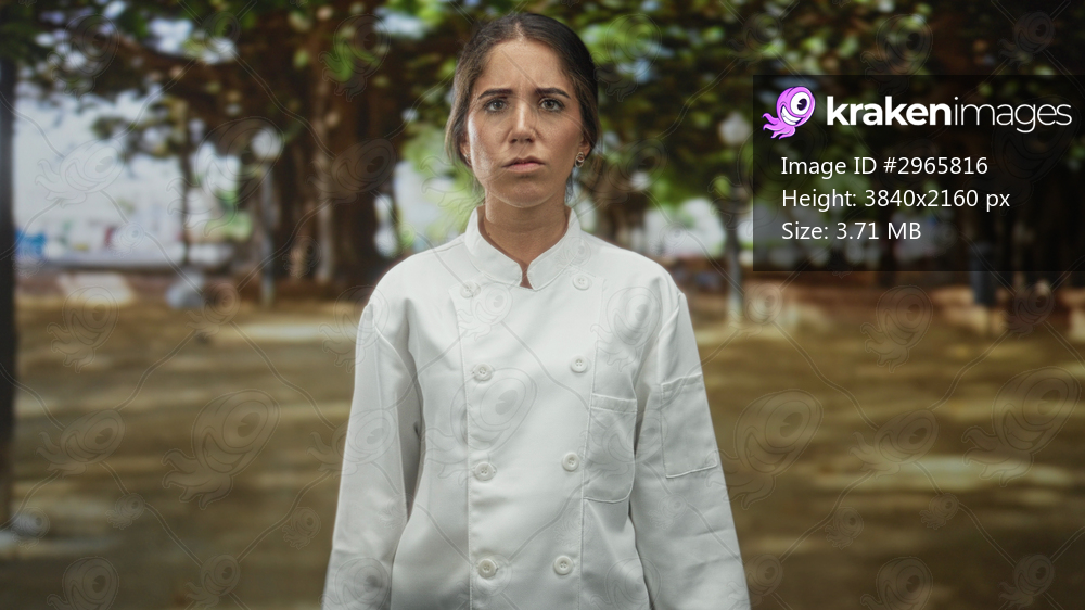 Woman chef holding head with both hands in a leafy park forest, wearing white chef coat and looking upward with tense expression; stress burnout.