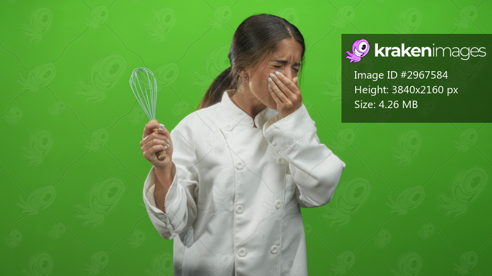 Woman chef holding whisk and covering mouth with hand while gagging and sneezing in studio; sneeze discomfort.