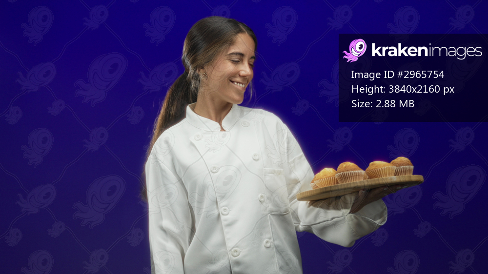 Woman chef holding wooden tray of muffins and smiling, presenting pastries in studio; joy hospitality.