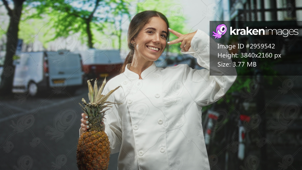 Woman chef holds a pineapple and makes a peace sign near her eye in street market setting, wearing chef jacket; playful confidence.