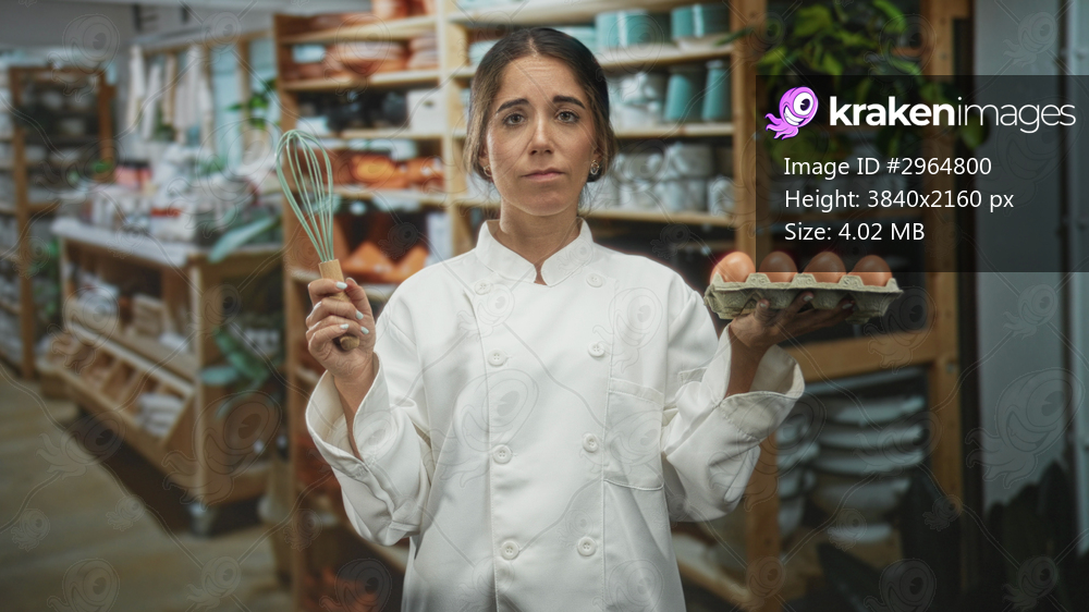 Woman chef holds a whisk in one hand and an egg carton in the other amid pantry shelves of cookware inside a building; uncertainty decision.