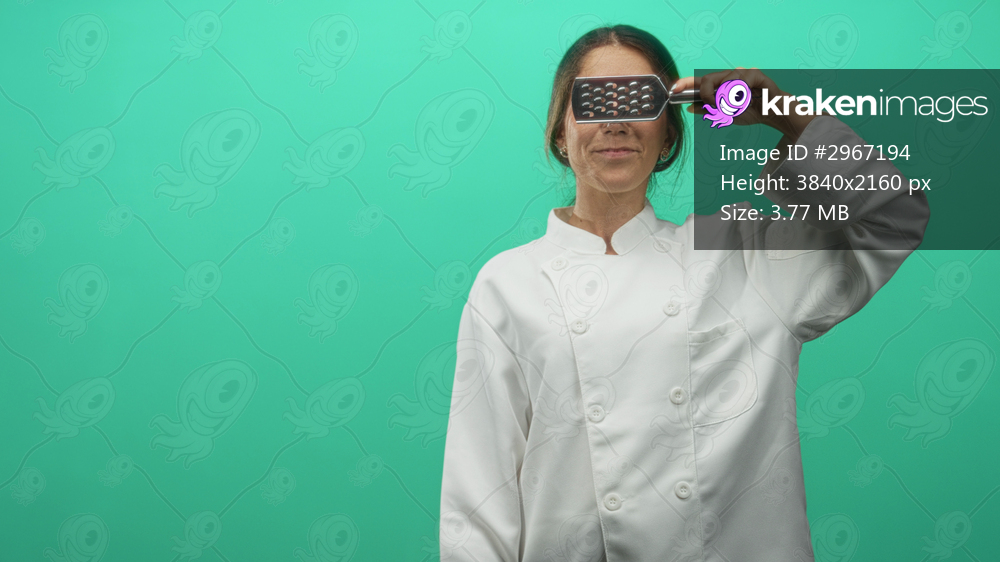 Woman chef holds metal grater over eye while smiling in a green studio wearing a white chef coat and buttons visible; playful.