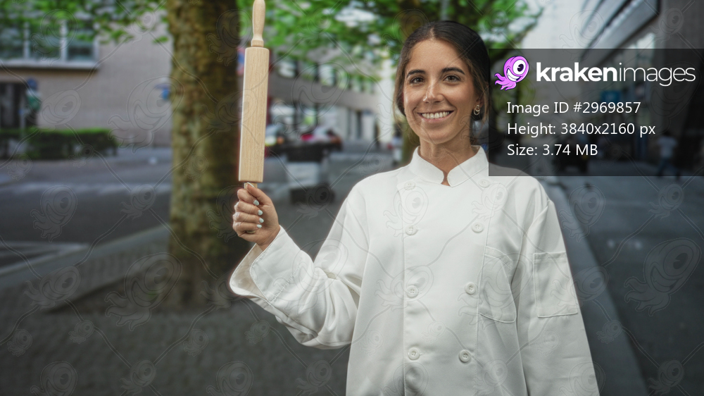 Woman chef holds rolling pin upright on street, smiling in a white chef coat; confidence craft tradition.