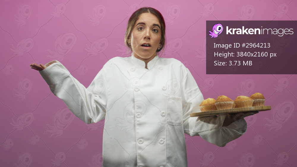 Woman chef in a white coat holds a wooden board of muffins and shrugs with palms up in a pink studio; uncertainty doubt.