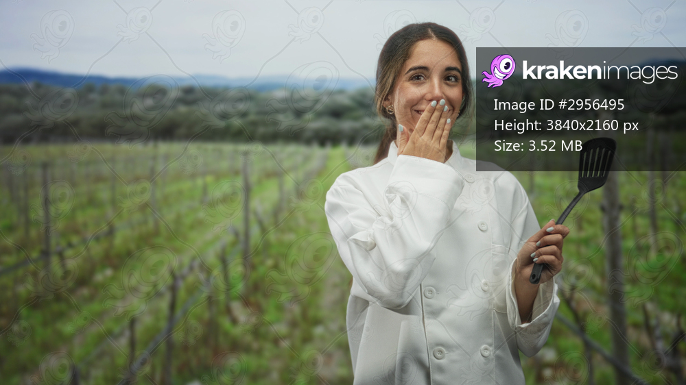 Woman chef in white coat covers mouth with hand and holds a spatula amid vineyard rows in a forest; surprise rustic cooking.