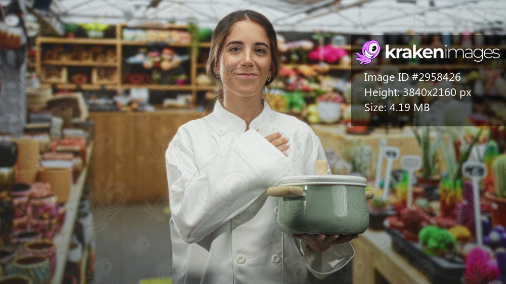 Woman chef in white coat holding a green cooking pot, palm supporting base, other hand on chest, stands amid potted plants in a building; pride craft tradition. - Kraken Images
