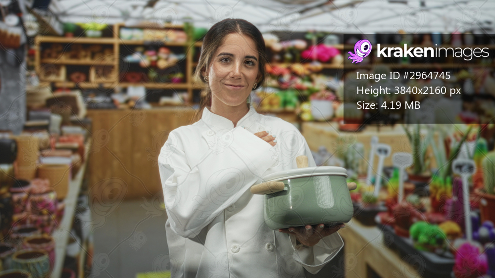 Woman chef in white coat holding a green cooking pot, palm supporting base, other hand on chest, stands amid potted plants in a building; pride craft tradition. - Kraken Images