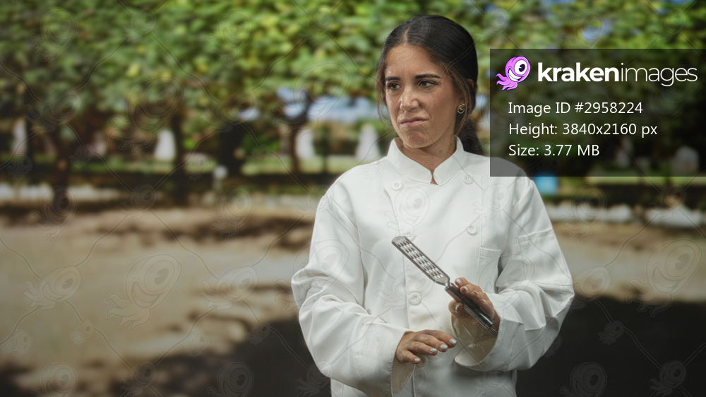 Woman chef in white coat holds a grater and recoils with a grimace against a studio backdrop; hesitation disgust.